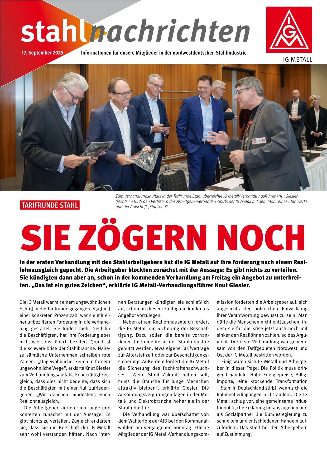 In der nordwestdeutschen Stahlindustrie arbeiten 60 000 Beschäftigte. Die zweite Verhandlung findet am 19. September statt. Die Friedenspflicht endet am 30.09.2025 um Mitternacht.