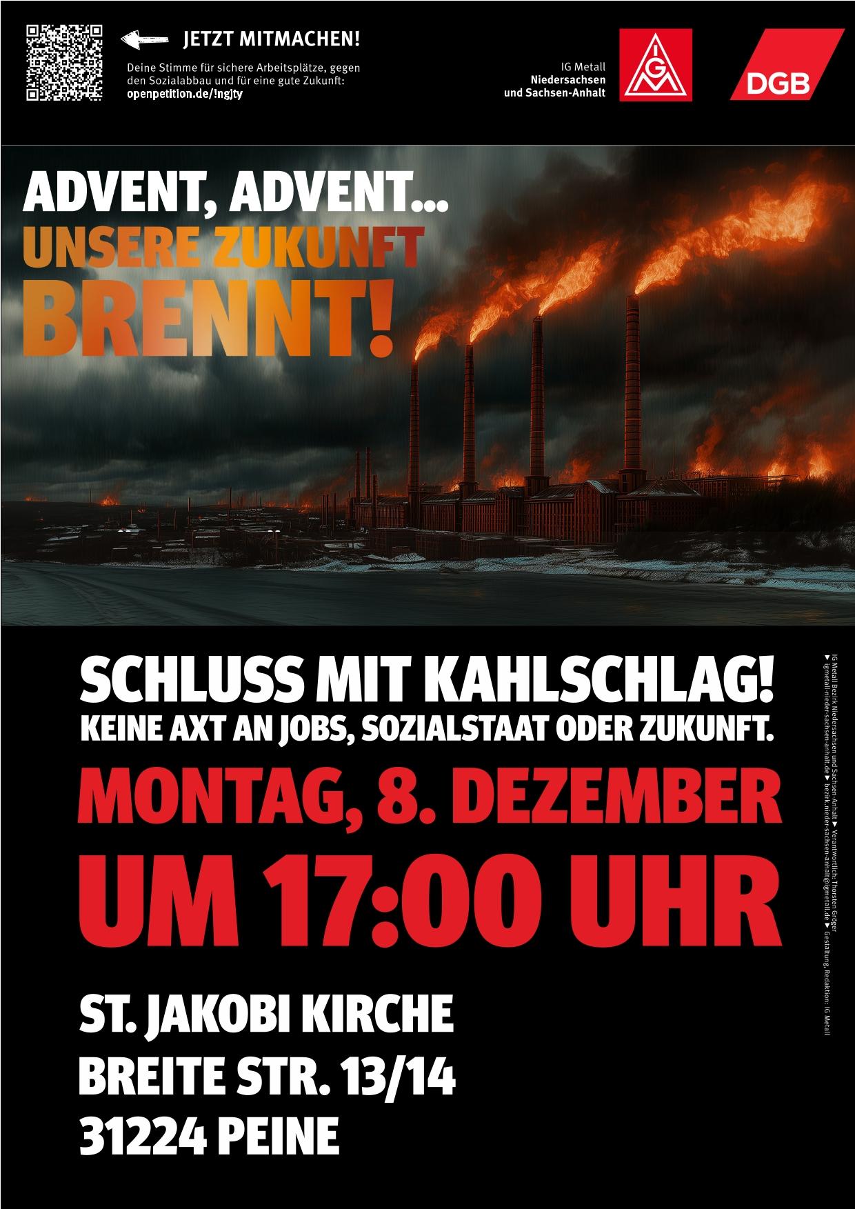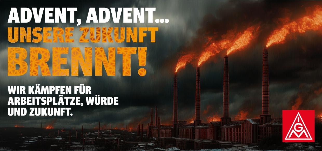 Diese Petition ist nur ein Baustein unserer Kampagne „Advent, Advent – unsere Zukunft brennt“. In zahlreichen Regionen organisieren die IG Metall-Geschäftsstellen Aktionen, Demonstrationen mit Kundgebungen, Infoveranstaltungen, sind sichtbar bei Betriebsversammlungen oder werden anders kreativ. Und dein eigener Erfindergeist ist gefragt!